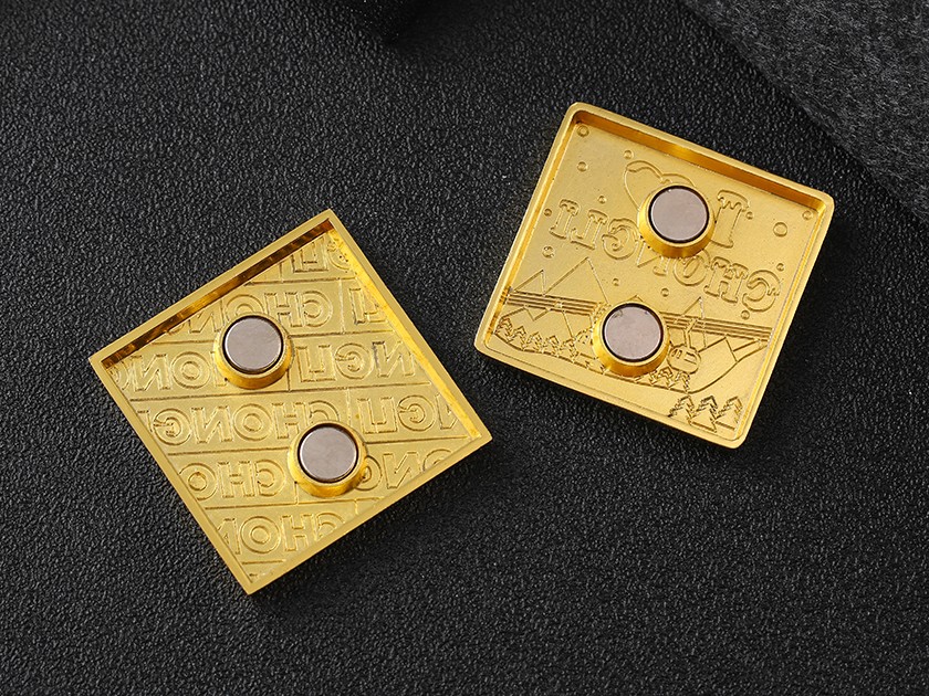 【制作工藝】:沖壓 【上色工藝】:烤漆 【電鍍顏色】:金色 【背面工藝】:金屬凹凸 【產(chǎn)品配件】:磁鐵扣